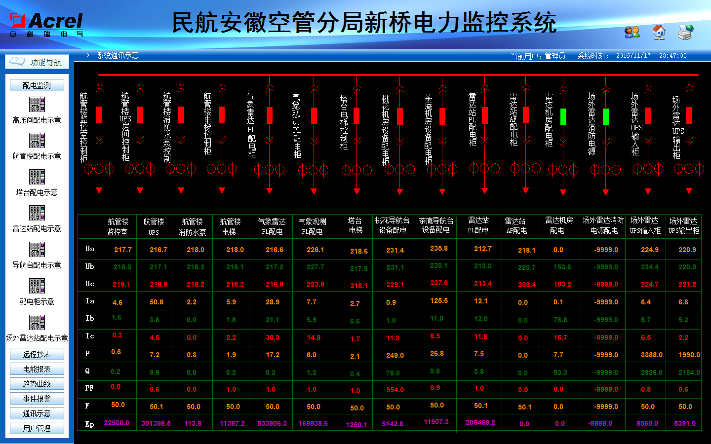安徽空管分局新橋機場配電系統包括導航臺、航管樓、塔臺、二次雷達等,原導航臺、航管樓、塔臺等已經建設完畢,且已經納入電力監控系統,本次主要針對二次雷達站配電監控系統接入原電力監控系統,并對原軟件進行進一步功能升級。