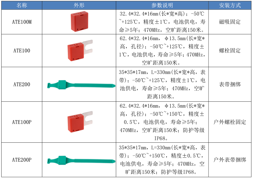 溫度傳感器 a. 電池供電型無線溫度傳感器 安裝于發熱部位,采集溫度量并通過無線方式傳輸的傳感器。 目前無線溫度傳感器有四款: b. CT 感應取電無線溫度傳感器 安裝于斷路器觸頭、母排、電纜搭接點等大電流處,采集溫度量并通過無線方式傳輸的傳感器。 目前無線溫度傳感器有兩款: c. 有線溫度傳感器 安裝于低壓柜接點或變壓器繞組、電機繞組的測溫,采集溫度量并通過有線方式傳輸的傳感器。 目前有線測溫傳感器是Pt100: 接收/顯示單元 a. 接收單元 b. 顯示單元