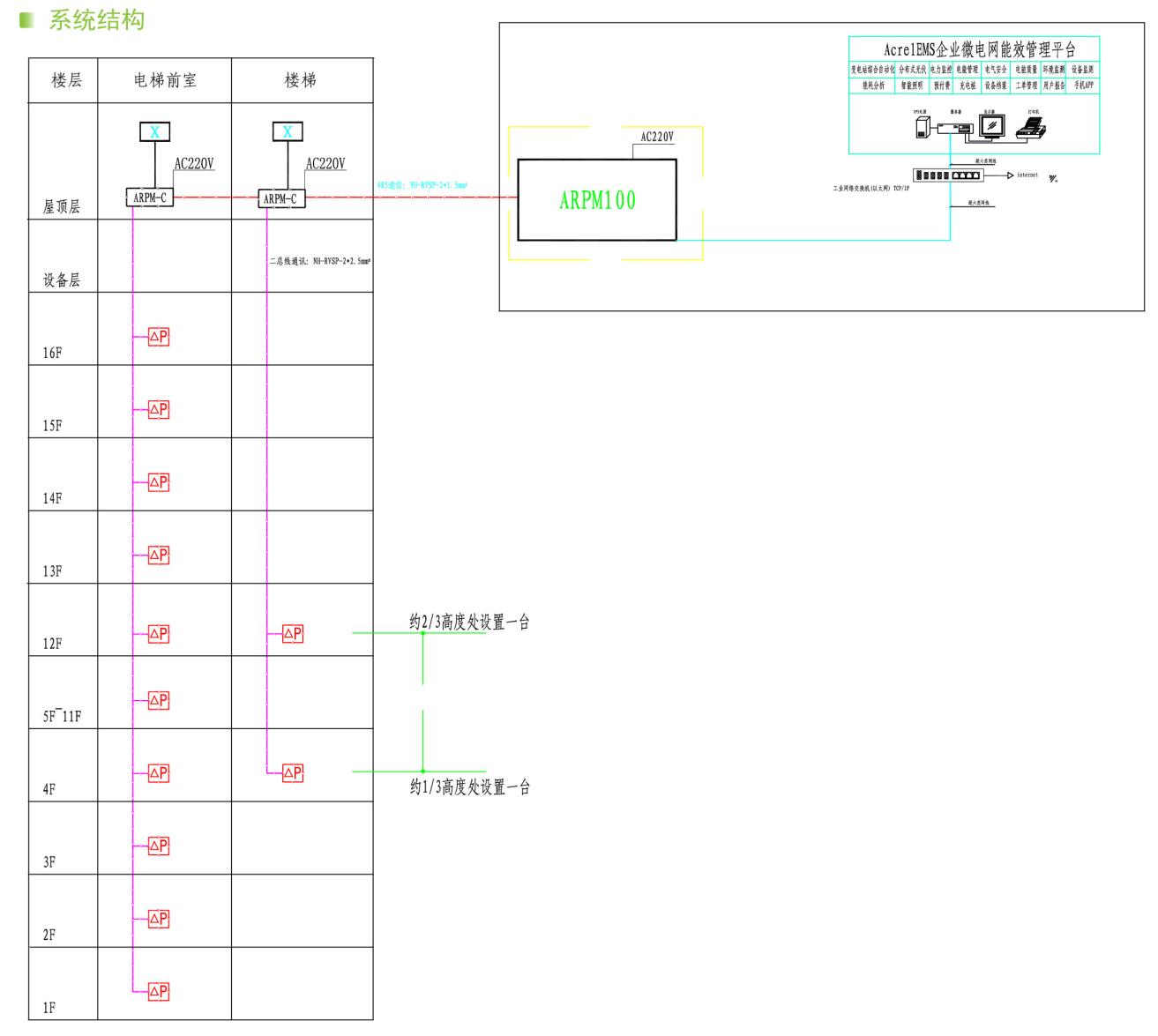 在建筑物內公共區域走道、封閉樓梯間、防煙樓梯間及其前室、消防電梯及其前室或合用前室等處設置余壓探測器,用于檢測相應區域兩側的壓力差值;加壓風機處設置余壓控制器,當加壓送風機啟動后,控制器根據余壓探測器超壓/加壓動作指令,控制泄壓閥動作,確保上述區域的壓差值滿足規范要求;泄壓閥處安裝風閥執行器,用于將余壓控制器輸出的控制信號轉換為執行動作,控制泄壓的開關,實現加壓送風系統的風量隨系統調節,余壓監控器安裝在安防消防控制室。根據用戶的需求,余壓監控系統可以滿足與AcrelEMS企業微電網管理云平臺或電氣火災自動報警系統等進行數據交換和共享。