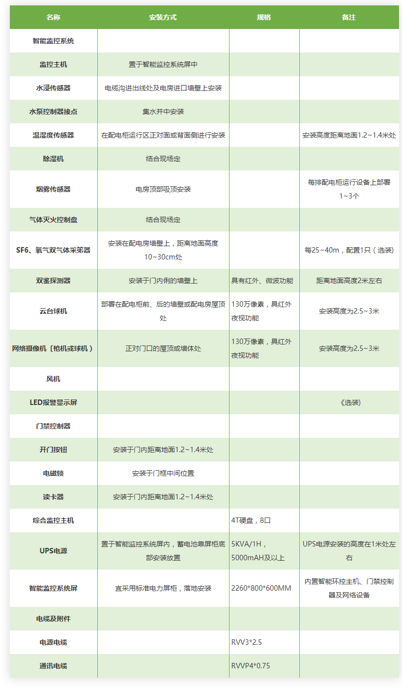 配電室綜合監控系統包括智能監控系統屏、通訊管理機、UPS電源、視頻監控子系統(云臺球機、槍機)、環境監測子系統(溫度、濕度、水浸、煙感)、控制子系統(燈光、空調、除濕機、風機、水泵)、門禁監控子系統(讀卡器、開門按鈕、磁力鎖)、安防監控子系統(雙鑒檢測器)。