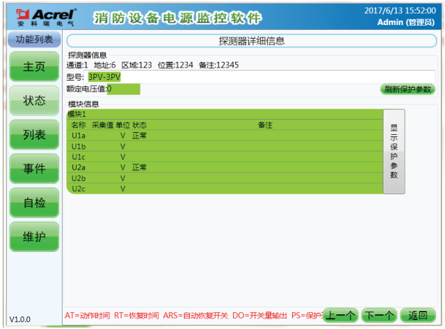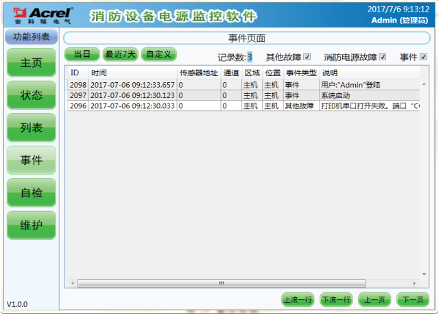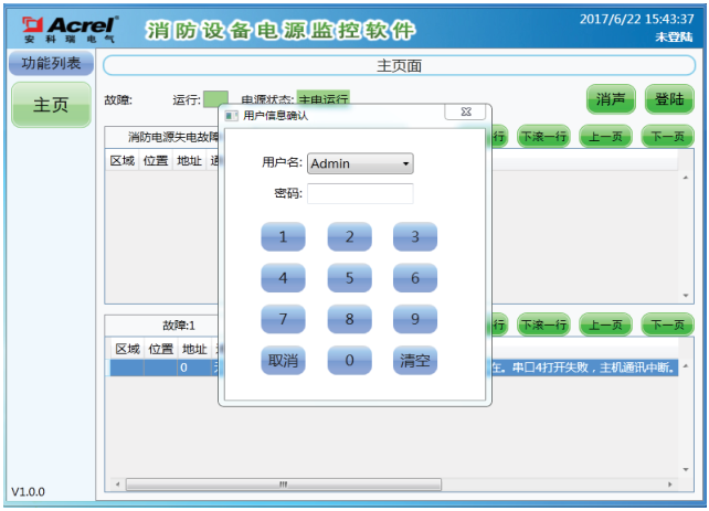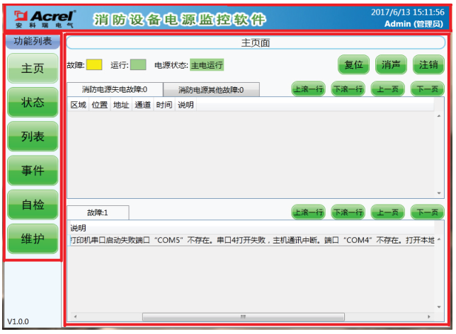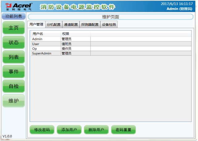 系統運行主界面 包含“軟件標題區”、“功能列表區”、“頁面顯示區”三部分,可以通過點擊“功能列表區”內按鈕進入各相關功能界面。 狀態監測界面 內置的內部設定參數、測量參數狀態參數,并可于該界面對監控裝置進行遠程解除報警或分合閘控制。 用戶登錄界面 選擇用戶名并輸入正確的密碼后,系統狀態欄會顯示當前的登錄用戶。本軟件針對的任意遠控操作均需權限登錄后方可操作,即防止無關人員誤操作。 權限管理界面 該界面可添加新的“操作員”和“值班員”權限的新用戶,也可刪除這兩個級別的現有用戶,該管理功能只有“超級管理員”和“管理員”可進行操作。 設備檢測界面 該檢測功能為“管理員”和“操作員”方可進行的操作功能,主要用于設備自檢和對監控系統柜體面板指示燈的手動檢測。 事件記錄界面 用戶于該界面內可查詢任意時段內相應報警或動作類型下的記錄,各級操作權限均可查看該界面的信息。