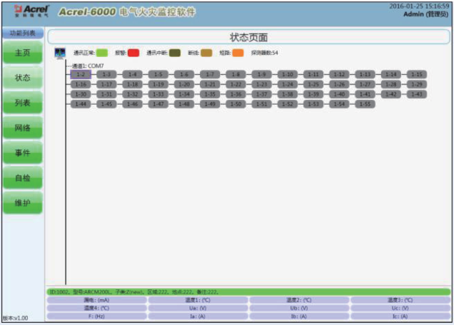 功能: Acrel-6000電氣火災監控系統是用于接收剩余電流式電氣火災監控探測器等現場設備信號,以實現對被保護電氣線路的報警、監視、控制、管理的運行于計算機的工業級硬件/軟件系統。本系統適用于智能樓宇、高層公寓、賓館、飯店、商廈、工礦企業、國家重點消防單位以及石油化工、文教衛生、金融、電信等領域,對分散在建筑內的探測器進行遙測、遙調、遙控、遙信,方便實現監控與管理。 應用場所: (1)辦公建筑(商務辦公等); (2)商業建筑(商場、金融機構建筑等); (3)旅游建筑(賓館飯店、娛樂場所等); (4)科教文衛建筑(文化、教育、科研、醫療衛生、體育建筑等); (5)通信建筑(郵電、通信、廣播、電視、數據中心等); (6)交通運輸建筑(機場、車站、碼頭建筑等)。