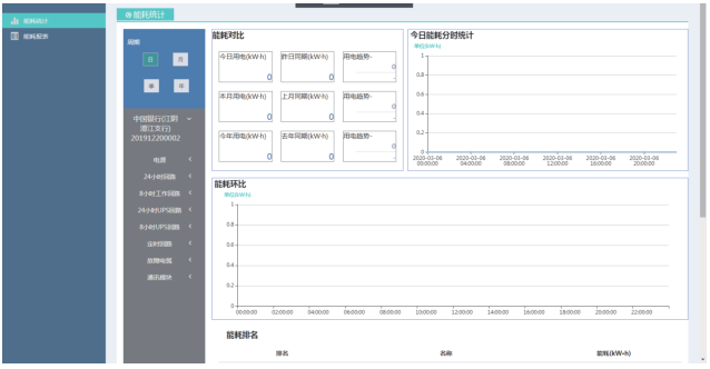 能耗統計界面 ,針對各個網點或者場所,平臺能夠針對整個網點或者單個回路,按照年、季度、月、日或者小時,對能耗進行查詢并統計,并對每個回路進行能耗的排名。