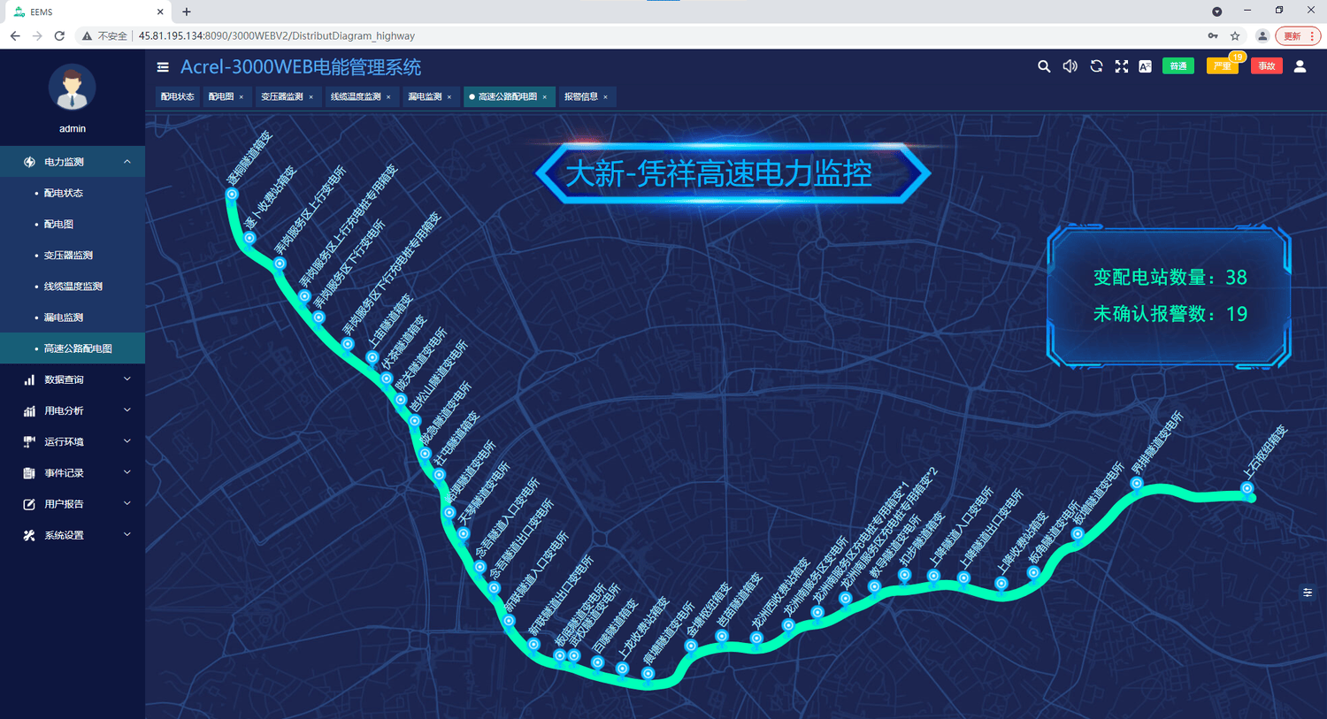大憑高速共64個變電所其中隧道配電房有44個,收費(fèi)站服務(wù)區(qū)配電房有20個,每個配電房均配置有電氣火災(zāi)探測器,高壓綜保,低壓多功能表,無功補(bǔ)償監(jiān)控裝置,溫控儀,UPS,EPS,柴發(fā)等設(shè)備。總計點位5300個左右。