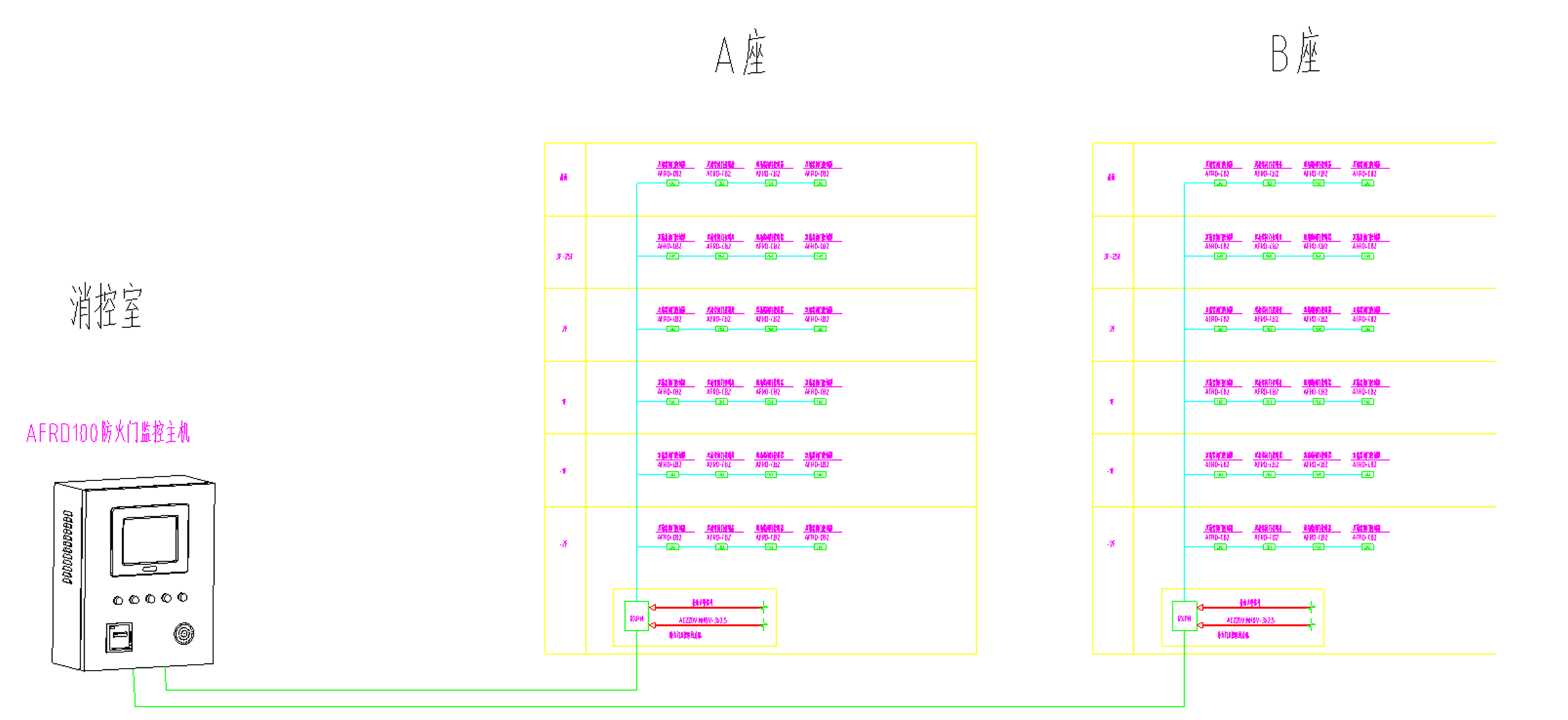 本項目為新疆?首府公館項目,現(xiàn)場各商住樓各樓道樓梯間及地下室區(qū)域的防火門安裝安科瑞AFRD系列防火門監(jiān)控模塊,在現(xiàn)場消防控制室設置安科瑞AFRD100/B壁掛式防火門監(jiān)控主機,并在各棟樓內(nèi)安裝監(jiān)控區(qū)域分機實時監(jiān)控各防火門狀態(tài),防止防火門被異常開啟。
